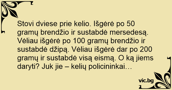Stovi dviese prie kelio. Išgėrė po 50 gramų brendžio ir sustabdė mersedesą. Vėliau išgėrė po 100 gramų brendžio ir sustabdė džipą. Vėliau išgėrė dar po 200 gramų ir sustabdė visą eismą. O ką jiems daryti? Juk jie – kelių policininkai…