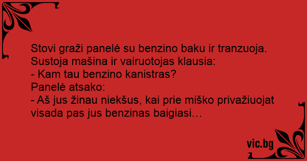 - Aš jus žinau niekšus, kai prie miško privažiuojat visada pas jus benzinas baigiasi…