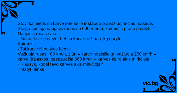 Važiuoja rusas 180 km/h, žiūri – karvė neatsilieka, važiuoja 260 km/h – karvė iš paskos, paspaudžia 360 km/h – karvės kairė akis mirkčioja.
