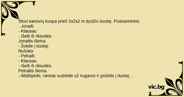 - Puskarininki, jau trys valandos, kareivinių tvora nenudažyta, o jūs čia