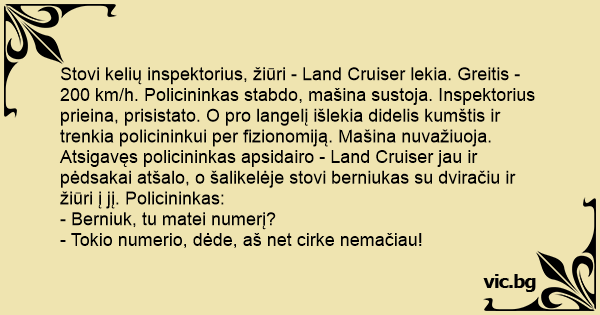 Stovi kelių inspektorius, žiūri - Land Cruiser lekia. Greitis - 200 km/h. Policininkas stabdo, mašina sustoja. Inspektorius prieina, prisistato. O pro langelį išlekia didelis kumštis ir trenkia policininkui per fizionomiją. Mašina nuvažiuoja. Atsigavęs policininkas apsidairo - Land Cruiser jau ir pėdsakai atšalo, o šalikelėje stovi berniukas su dviračiu ir žiūri į jį. Policininkas: