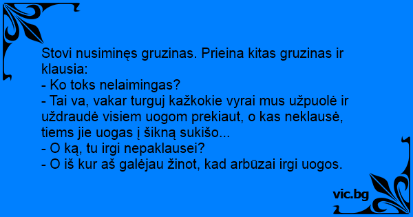 - Tai va, vakar turguj kažkokie vyrai mus užpuolė ir uždraudė visiem uogom prekiaut, o kas neklausė, tiems jie uogas į šikną sukišo...