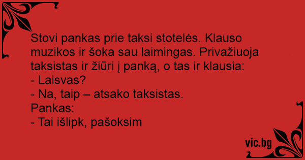 Stovi pankas prie taksi stotelės. Klauso muzikos ir šoka sau laimingas. Privažiuoja taksistas ir žiūri į panką, o tas ir klausia: