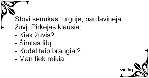 Stovi senukas turguje, pardavinėja žuvį. Pirkėjas klausia: