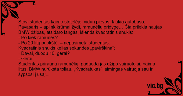 Stovi studentas kaimo stotelėje, vidurį pievos, laukia autobuso. Pavasaris – aplink krūmai žydi, ramunėlių pridygę… Čia prilekia naujas BMW džipas, atsidaro langas, išlenda kvadratinis snukis: