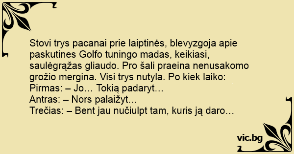 Stovi trys pacanai prie laiptinės, blevyzgoja apie paskutines Golfo tuningo madas, keikiasi, saulėgrąžas gliaudo. Pro šali praeina nenusakomo grožio mergina. Visi trys nutyla. Po kiek laiko: