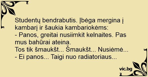 Studentų bendrabutis. Įbėga mergina į kambarį ir šaukia kambariokėms: