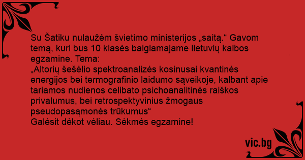 Su Šatiku nulaužėm švietimo ministerijos „saitą.“ Gavom temą, kuri bus 10 klasės baigiamajame lietuvių kalbos egzamine. Tema: