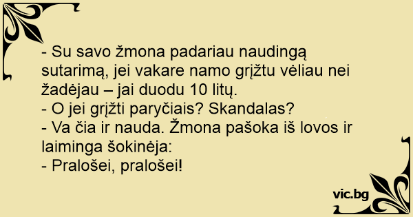 - Su savo žmona padariau naudingą sutarimą, jei vakare namo grįžtu vėliau nei žadėjau – jai duodu 10 litų.