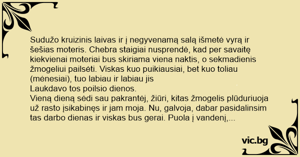 Vieną dieną sėdi sau pakrantėj, žiūri, kitas žmogelis plūduriuoja už rasto įsikabinęs ir jam moja. Nu, galvoja, dabar pasidalinsim tas darbo dienas ir viskas bus gerai. Puola į vandenį, ištempia jį į krantą, šaukia visas patenkintas: