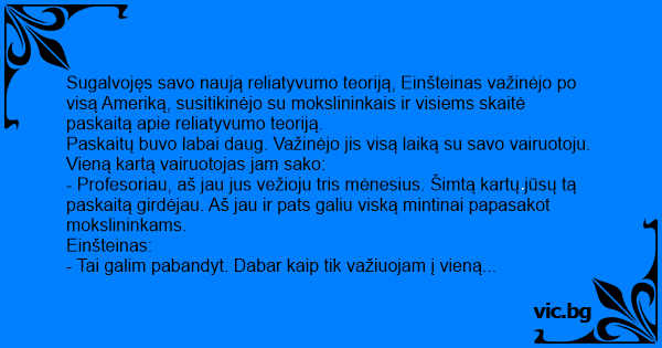 Taip ir sutarė. Atvažiavo jie į miestelį, susirinko mokslininkai, Einšteinas už vairo, o vairuotojas nuėjo paskaitos skaityt.