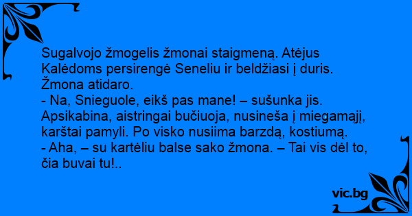 Sugalvojo žmogelis žmonai staigmeną. Atėjus Kalėdoms persirengė Seneliu ir beldžiasi į duris. Žmona atidaro.