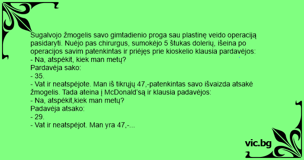 Sugalvojo žmogelis savo gimtadienio proga sau plastinę veido operaciją pasidaryti. Nuėjo pas chirurgus, sumokėjo 5 štukas dolerių, išeina po operacijos savim patenkintas ir priėjęs prie kioskelio klausia pardavėjos: