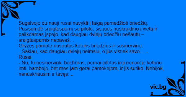 Sugalvojo du nauji rusai nuvykti į taigą pamedžioti briedžių. Pasisamdė sraigtasparnį su pilotu, šis juos nuskraidino į vietą ir palikdamas įspėjo, kad daugiau dviejų briedžių nešautų – sraigtasparnis nepaveš…