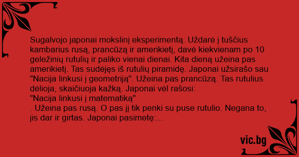 Sugalvojo japonai mokslinį eksperimentą. Uždarė į tuščius kambarius rusą, prancūzą ir amerikietį, davė kiekvienam po 10 geležinių rutulių ir paliko vienai dienai. Kita dieną užeina pas amerikietį. Tas sudėjęs iš rutulių piramidę. Japonai užsirašo sau "Nacija linkusi į geometriją". Užeina pas prancūzą. Tas rutulius dėlioja, skaičiuoja kažką. Japonai vėl rašosi:
