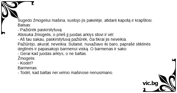 Pažiūrėjo, akurat, neveikia. Sutaisė, nuvažiavo iki baro, paprašė stiklinės degtinės ir papasakojo barmenui viską. O barmenas ir sako: