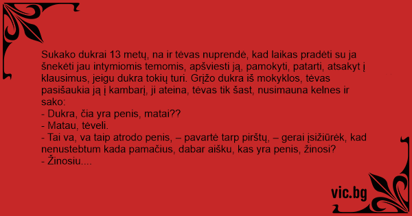 Sukako dukrai 13 metų, na ir tėvas nuprendė, kad laikas pradėti su ja šnekėti jau intymiomis temomis, apšviesti ją, pamokyti, patarti, atsakyt į klausimus, jeigu dukra tokių turi. Grįžo dukra iš mokyklos, tėvas pasišaukia ją į kambarį, ji ateina, tėvas tik šast, nusimauna kelnes ir sako: