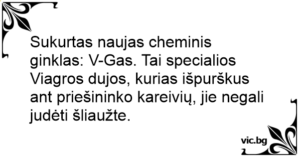 Sukurtas naujas cheminis ginklas: V-Gas. Tai specialios Viagros dujos, kurias išpurškus ant priešininko kareivių, jie negali judėti šliaužte.