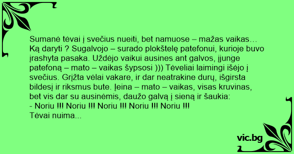 Sumanė tėvai į svečius nueiti, bet namuose – mažas vaikas… Ką daryti ? Sugalvojo – surado plokštelę patefonui, kurioje buvo įrashyta pasaka. Uždėjo vaikui ausines ant galvos, įjunge patefoną – mato – vaikas šypsosi ))) Tėveliai laimingi išėjo į svečius. Grįžta vėlai vakare, ir dar neatrakine durų, išgirsta bildesį ir riksmus bute. Įeina – mato – vaikas, visas kruvinas, bet vis dar su ausinėmis, daužo galvą į sieną ir šaukia: