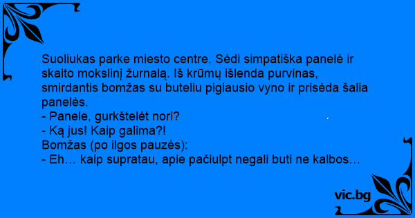 Suoliukas parke miesto centre. Sėdi simpatiška panelė ir skaito mokslinį žurnalą. Iš krūmų išlenda purvinas, smirdantis bomžas su buteliu pigiausio vyno ir prisėda šalia panelės.