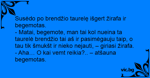 - Matai, begemote, man tai kol nueina ta taurelė brendžio tai aš ir pasimėgauju taip, o tau tik šmukšt ir nieko nejauti, – giriasi žirafa.