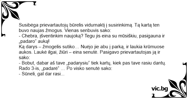 Ką darys – žmogelis sutiko… Nuėjo jie abu į parką, ir laukia krūmuose aukos. Laukė ilgai, žiūri – eina senutė. Pasigavo prievartautojas ją ir sako: