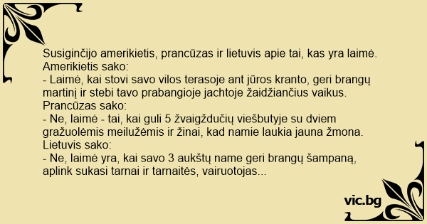 Susiginčijo amerikietis, prancūzas ir lietuvis apie tai, kas yra laimė. Amerikietis sako: