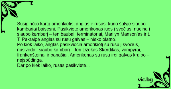 Susiginčijo kartą amerikietis, anglas ir rusas, kurio šalyje siaubo kambariai baisesni. Pasikvietė amerikonas juos į svečius, nueina į siaubo kambarį – ten baubai, terminatoriai, Marilyn Manson’as ir t. T. Pakraipė anglas su rusu galvas – nieko blatno.