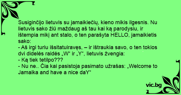 Susiginčijo lietuvis su jamaikiečių, kieno mikis ilgesnis. Nu lietuvis sako žiū maždaug aš tau kai ką parodysiu, ir ištempia mikį ant stalo, o ten parašyta HELLO, jamaikietis sako: