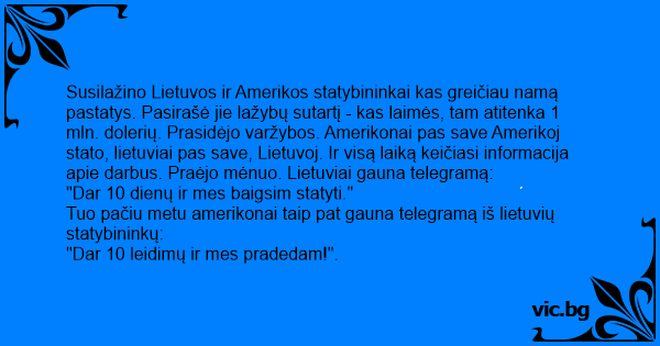 Susilažino Lietuvos ir Amerikos statybininkai kas greičiau namą pastatys. Pasirašė jie lažybų sutartį - kas laimės, tam atitenka 1 mln. dolerių. Prasidėjo varžybos. Amerikonai pas save Amerikoj stato, lietuviai pas save, Lietuvoj. Ir visą laiką keičiasi informacija apie darbus. Praėjo mėnuo. Lietuviai gauna telegramą: