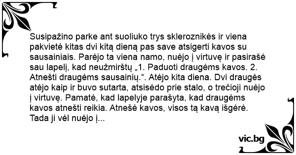 Susipažino parke ant suoliuko trys skleroznikės ir viena pakvietė kitas dvi kitą dieną pas save atsigerti kavos su sausainiais. Parėjo ta viena namo, nuėjo į virtuvę ir pasirašė sau lapelį, kad neužmirštų „1. Paduoti draugėms kavos. 2. Atnešti draugėms sausainių.“. Atėjo kita diena. Dvi draugės atėjo kaip ir buvo sutarta, atsisėdo prie stalo, o trečioji nuėjo į virtuvę. Pamatė, kad lapelyje parašyta, kad draugėms kavos atnešti reikia. Atnešė kavos, visos tą kavą išgėrė. Tada ji vėl nuėjo į virtuvę. Pamatė lapelį. Jame buvo parašyta, kad draugėms kavos reikia atnešti. Atnešė draugėms kavos. Jos tą kavą išgėrė. Ji vėl nuėjo į virtuvę, pamatė lapelį, atnešė kavos…ir taip 10 kartų. Na, žodžiu, išgėrė jos po kokius du litrus kavos, pastebėjo, kad jau vėlu ir nusprendė, kad jau laikas namo. Išėjo abi. Viena ir sako kitai: