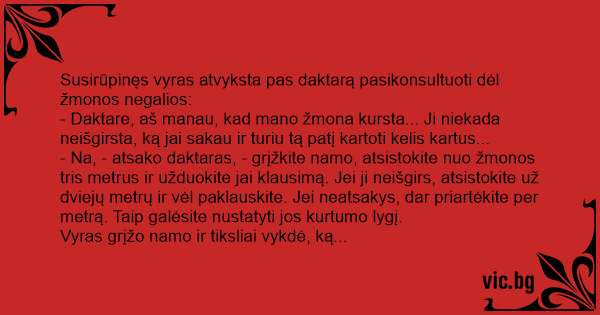 - Daktare, aš manau, kad mano žmona kursta... Ji niekada neišgirsta, ką jai sakau ir turiu tą patį kartoti kelis kartus...