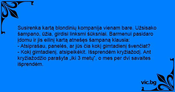 Susirenka kartą blondinių kompanija vienam bare. Užsisako šampano, ūžia, girdisi linksmi šūksniai. Barmenui pasidaro įdomu ir jis eilinį kartą atnešęs šampaną klausia: