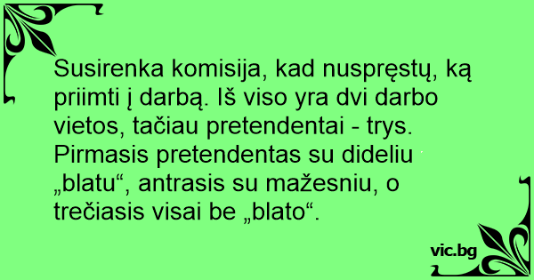 Susirenka komisija, kad nuspręstų, ką priimti į darbą. Iš viso yra dvi darbo vietos, tačiau pretendentai - trys. Pirmasis pretendentas su dideliu „blatu“, antrasis su mažesniu, o trečiasis visai be „blato“.