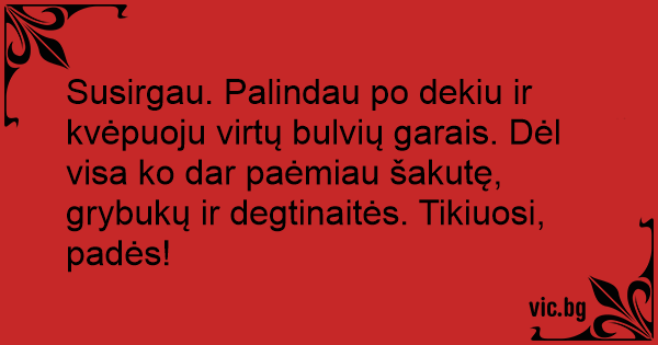 Susirgau. Palindau po dekiu ir kvėpuoju virtų bulvių garais. Dėl visa ko dar paėmiau šakutę, grybukų ir degtinaitės. Tikiuosi, padės!