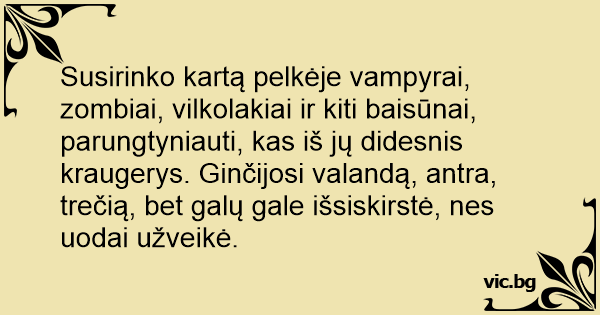 Susirinko kartą pelkėje vampyrai, zombiai, vilkolakiai ir kiti baisūnai, parungtyniauti, kas iš jų didesnis kraugerys. Ginčijosi valandą, antra, trečią, bet galų gale išsiskirstė, nes uodai užveikė.