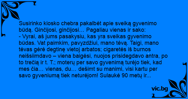 Susirinko kiosko chebra pakalbėt apie sveiką gyvenimo būdą. Ginčijosi, ginčijosi… Pagaliau vienas ir sako: