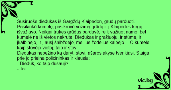 Susiruošė diedukas iš Gargždų Klaipėdon, grūdų parduoti. Pasikinkė kumelę, prisikrovė vežimą grūdų ir į Klaipėdos turgų išvažiavo. Neilgai trukęs grūdus pardavė, reik važiuot namo, bet kumelė nė iš vietos nekruta. Diedukas ir gražiuoju, ir stūmė, ir įkalbinėjo, ir į ausį šnibždėjo, meilius žodelius kalbėjo… O kumelė kaip stovėjo vietoj, taip ir stovi.