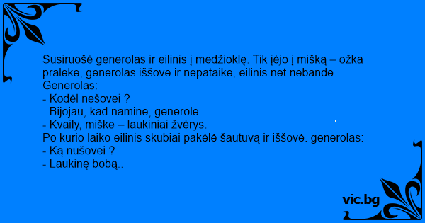 Susiruošė generolas ir eilinis į medžioklę. Tik įėjo į mišką – ožka pralėkė, generolas iššovė ir nepataikė, eilinis net nebandė. Generolas: