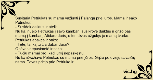 Nu ką išvažiavo Petriukas su mama prie jūros. Grįžo po dviejų savaičių namo. Tėvas priėjo prie Petriuko ir klausia: