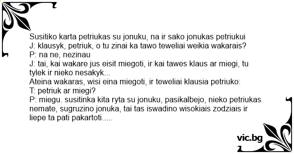P: miegu. susitinka kita ryta su jonuku, pasikalbejo, nieko petriukas nemate, sugruzino jonuka, tai tas iswadino wisokiais zodziais ir liepe ta pati pakartoti.. wel atejo wakaras