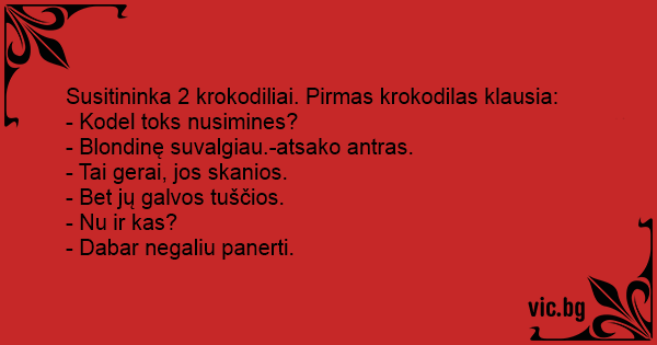 Susitininka 2 krokodiliai. Pirmas krokodilas klausia: