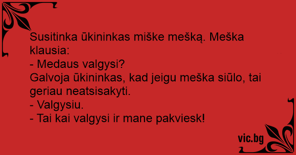 Susitinka ūkininkas miške mešką. Meška klausia: