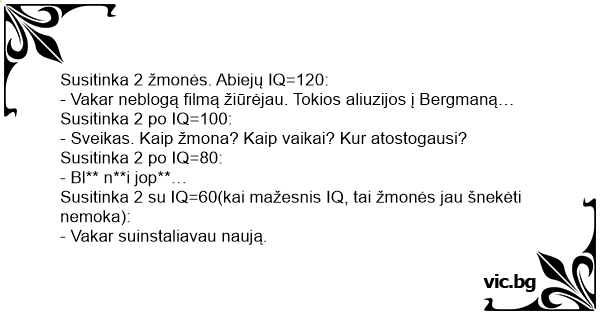 Susitinka 2 su IQ=60(kai mažesnis IQ, tai žmonės jau šnekėti nemoka):