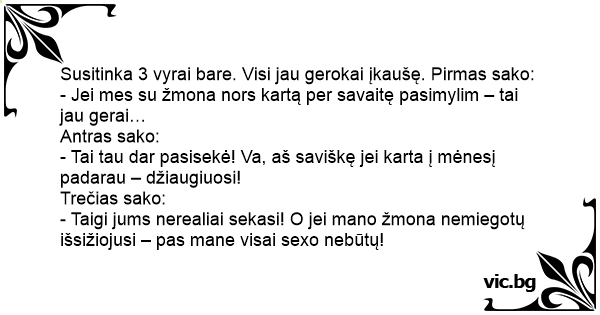 Susitinka 3 vyrai bare. Visi jau gerokai įkaušę. Pirmas sako: