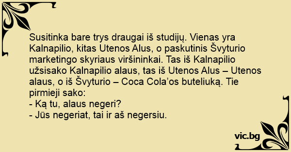 Susitinka bare trys draugai iš studijų. Vienas yra Kalnapilio, kitas Utenos Alus, o paskutinis Švyturio marketingo skyriaus viršininkai. Tas iš Kalnapilio užsisako Kalnapilio alaus, tas iš Utenos Alus – Utenos alaus, o iš Švyturio – Coca Cola’os buteliuką. Tie pirmieji sako: