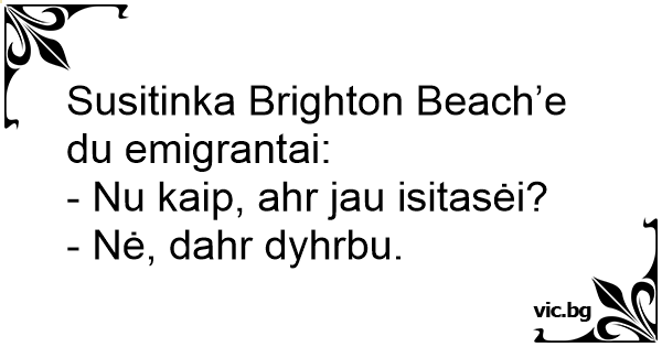 Susitinka Brighton Beach’e du emigrantai:- Nu kaip, ahr jau isitasėi?- Nė, dahr dyhrbu. 0 0 0 Anekdotai