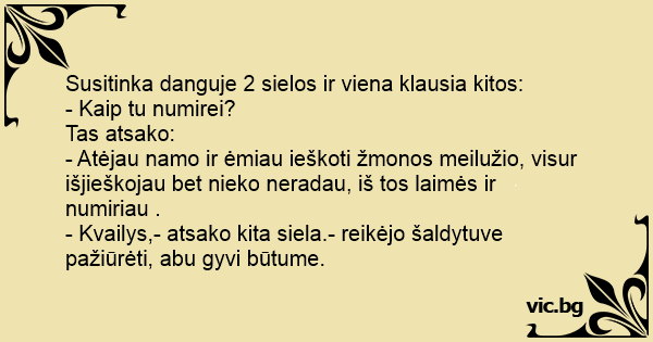 - Kvailys,- atsako kita siela.- reikėjo šaldytuve pažiūrėti, abu gyvi būtume.