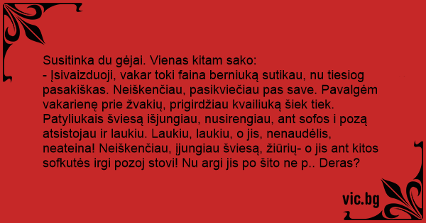 - Įsivaizduoji, vakar toki faina berniuką sutikau, nu tiesiog pasakiškas. Neiškenčiau, pasikviečiau pas save. Pavalgėm vakarienę prie žvakių, prigirdžiau kvailiuką šiek tiek. Patyliukais šviesą išjungiau, nusirengiau, ant sofos i pozą atsistojau ir laukiu. Laukiu, laukiu, o jis, nenaudėlis, neateina! Neiškenčiau, įjungiau šviesą, žiūrių- o jis ant kitos sofkutės irgi pozoj stovi! Nu argi jis po šito ne p.. Deras?