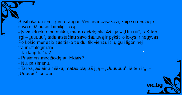 - Įsivaizduok, einu mišku, matau didelę olą. Aš į ją – „Uuuuu“, o iš ten irgi – „uuuuu“, tada atstačiau savo šautuvą ir pykšt, o lokys ir negyvas. Po kokio mėnesio susitinka tie du, tik vienas iš jų guli ligoninėj, traumatologiniam.